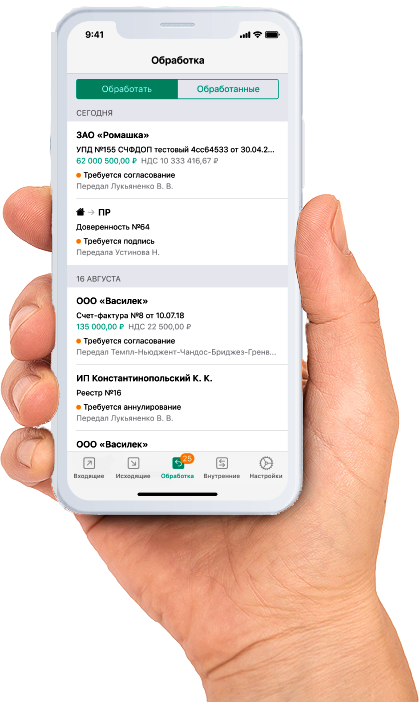 Контролируйте передачу и подписание документов с помощью онлайн-статусов. За минуту подпишите документы, аннулируйте или откажите в подписи с указанием причины.